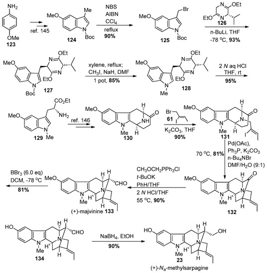 Synthesis of the desired sarpagine unit 23 began from p-anisidine 123 (Scheme 14) [145]. The 5-methoxy-3-methylindole-2-carboxylate was prepared on 600 gram scale via a Japp-Klingmann azo-ester intermediate [146]. The subsequent saponification was followed by a copper/quinoline-mediated decarboxylation process executed again on large scale in excellent yield. In this process only 2 equivalents of distilled quinoline were employed in contrast to the previous methods, which require a very large excess of quinoline. This latter route was difficult because the excess quinoline was hard to remove. The Na-H group was protected with a Boc function by treating it with Boc-anhydride and dimethyl amino pyridine to provide 124 in 95% yield. The regiospecific bromination of the C-3 alkyl group was done carefully under radical conditions with N-bromosuccinimide and AIBN (admixed and added in portions) in carbon tetrachloride on large scale and in excellent yield to furnish 125. This radical reaction was also executed in refluxing cyclohexane with similar results. The 3-bromomethyl indole was found to be very unstable and was used without further purification. It was treated with the anion of the Schӧllkopf chiral auxiliary 126 at −78 °C to afford a single diastereomer 127 in 93% yield. The Boc group was removed under thermal conditions and this was followed by Na-methylation with iodomethane and sodium hydride in DMF to provide the Na-methyl tryptophan precursor 128. The dihydropyrazine moiety present in the Schӧllkopf unit was hydrolyzed under acidic conditions in ethanol to furnish the 5-methoxy-Na-methyl d-(+)-tryptophan ethyl ester 129 on large scale. The usual subsequent transformations e.g., Nb-benzylation, asymmetric Pictet-Spengler condensation, diastereospecific Dieckmann cyclization-decarboxylation reaction and catalytic debenzylation on palladium/carbon to remove the Nb-benzyl group afforded the 5-methoxy tetracyclic ketone 130 in excellent overall yield. The Nb-nitrogen atom was re-alkylated with the vinyl iodide, (Z)-1-bromo-2-iodo-2-butene 61 (prepared regiospecifically on 500 gram scale) to give iodo olefin 131, which underwent the enolated-driven palladium-catalyzed cross-coupling to provide the α-vinylated intermediate, the key pentacyclic ketone 132 [144,145]. The conversion of the E-ethylidene intermediate 132 into the α-aldehyde [(+)-majvinine] 133 was effected using a one-carbon homologation sequence by Wittig olefination followed by hydrolysis/epimerization as employed previously in Milwaukee. The C-10 methoxy alkyl group was removed using 6.0 equivalents of boron tribromide in DCM at −78 °C to yield the 10-hydroxy intermediate 134 and this was followed by reduction of the aldehyde with sodium borohydride in ethanol to the primary alcohol in (+)-Na-methylsarpagine 23 in 90% yield over the two steps. This constituted the first enantiospecific total synthesis of (+)-majvinine and of (+)-Na-methylsarpagine 23 [144,145].