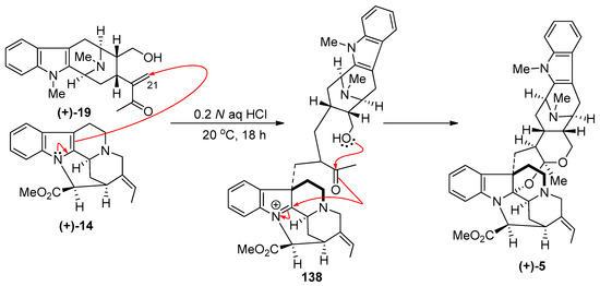 The structure of 13 was proposed, in a biomimetic sense, for (−)-alstonisidine from its constituent monomeric units, (+)-quebrachidine 20 and (+)-macroline 19. The crystal structure of (−)-alstonisidine was ultimately reported by Hoard in 1977 which confirmed the structure as 13 (Figure 6) [76]. When the mixture of 19 and 20 was stirred in 0.2 N aqueous HCl, the labile hemiketal 42 formed, as indicated by examination of the spectral data. The tentative stereochemistry was based on the structure of the bulky quebrachidine unit which bore a –CH2– group which should occupy the equatorial position. The hemiketal was treated with boron trifluoride etherate to yield alstonisidine which suggested the structure 42 as an intermediate, since no reaction occurred under the same conditions between (+)-quebrachidine 20 and (+)-macroline 19 [75].