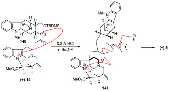 (+)-Macralstonidine 8 represents another dimeric indole alkaloid which consists of a macroline and a sarpagine obligate monomeric unit. It has been isolated from Alstonia macrophylla [127,128], Alstonia somersentenis [127], and Alstonia spectabilis [133]. The alkaloid, Na-methylsarpagine (23) is a natural product isolated from Alstonia spectabilis by Hart et al. [133]. Zhao et al. reported the first total synthesis of (+)-Na-methylsarpagine, as well as the total synthesis of (+)-macralstonidine, along with several other indole alkaloids [144,145]. The synthesis of (+)-Na-methylsarpagine accompanied by the total synthesis of (+)-macroline vide supra by the group in Milwaukee [85,86] constituted a total synthesis of this bisindole alkaloid.