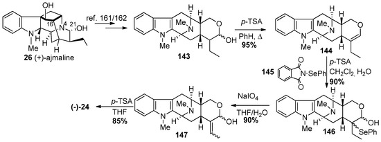 Alternatively, the ketone 116 underwent the ring opening process under conditions similar to LeQuesne et al. [140] to 120. The dihydroalstophylline upon treatment with IBX and p-TSA in toluene and DMSO gave (−)-alstophylline 22, albeit the yield of this step was only moderate.