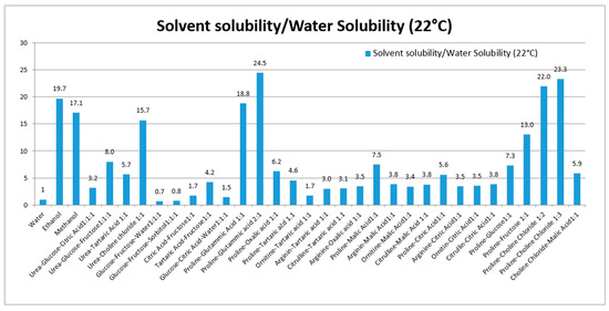 Various NADES composed of urea, amino acids, sugars and choline were used to solubilize rutin. Thirty NADES were selected and used for evaluation of rutin solubility. Water and ethanol were used as reference solvents due to their favorable use as solvents in the production of extracts for nutraceuticals and functional foods. Water was selected as a reference, because of the poor rutin solubility (120 μg/mL at 22 °C). For comparison purposes, the solubility ratio (solvent/water) was used. The solubility and solubility ratios of rutin in each solvent are reported in Table 1 and summarized in Figure 1.