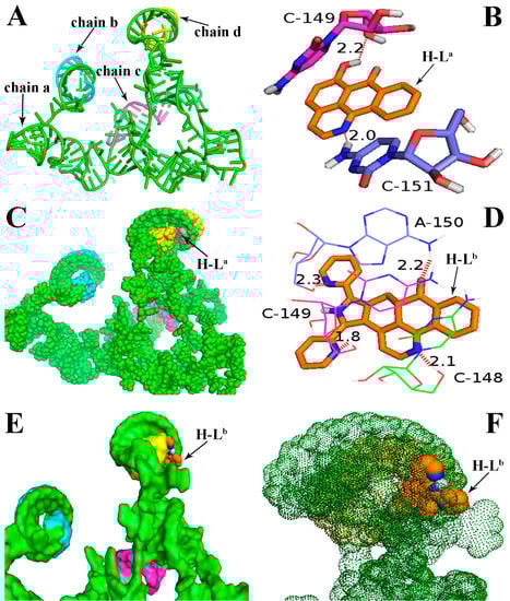 Binding mode of the ligands H-La and H-Lb with human telomerase RNA (hTR). (A) Three-dimensional conformation model of hTR (PDB ID: 2INA), which was not reported in the RCSB protein data bank (http://www.rcsb.org). The bases and chains are represented as a cartoon; (B) Two H-bonds were formed between H-La and the receptor 2INA; (C) H-La was embedded in the active pocket; (D) Four H-bonds were formed between H-Lb and the receptor 2INA; (E,F) H-Lb was surrounded by a “fog” formed by chains a and d. In Figure 2B,D, the ligands are represented as ball-and-stick models and colored by atom type. Hydrogen bonds are represented by red dotted lines. White: hydrogen atom; red: oxygen atom; dark blue: nitrogen atom; orange: the backbone and carbon atom of the ligands H-La and H-Lb.