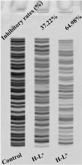 The IC50 values of the two oxoisoaporphine ligands H-La and H-Lb were measured using the 3-(4,5-dimethylthiazol-2-yl)-2,5-diphenyltetrazolium bromide (MTT) method against the human normal liver HL-7702 cell line [19,21] and several human cancer cell lines (including T-24, HCT-8, Hep-G2, SK-OV-3/DDP, SK-OV-3, BEL-7402, and NCI-H460 tumor cells). Figure 3 shows that, compared with H-La, H-Lb exhibited stronger cytotoxicity against all tested cell lines except SK-OV-3/DDP. Notably, H-Lb was approximately 250% more potent than H-La against SK-OV-3 cells. Therefore, we further studied the inhibition of telomerase activity in SK-OV-3 cells by the two oxoisoaporphine ligands H-La (100 µM) and H-Lb (IC50 = 39.5 µM) through TRAP-silver staining assay.