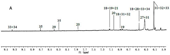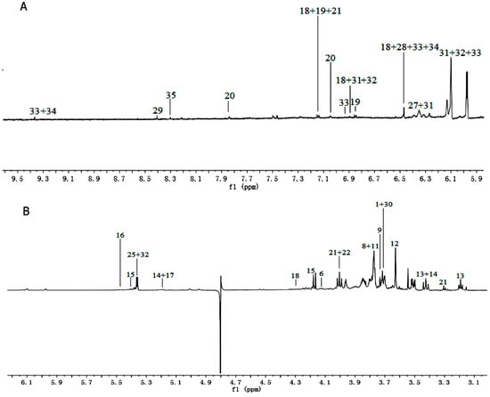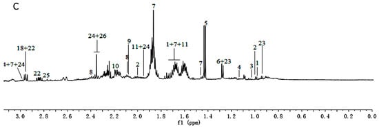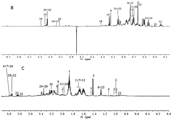 1H-NMR spectra (600 MHz) of aqueous methanol fractions in PR from FJZR in low field region (A); middle field region (B) and high field region (C). NMR solvent: CD3OD:KH2PO4 buffer in D2O 1:1.