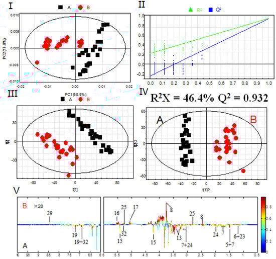 PCA scores plot (I); permutation test with 200 permutations of PLS-DA model (II); PLS-DA scores plot (III); OPLS-DA scores plot (IV); correlation coefficients loading plot (V) obtained from 1H-NMR metabolic profiles derived from aqueous methanol fractions of PR from different cultivation fields. (A) JSJR; (B) FJZR.