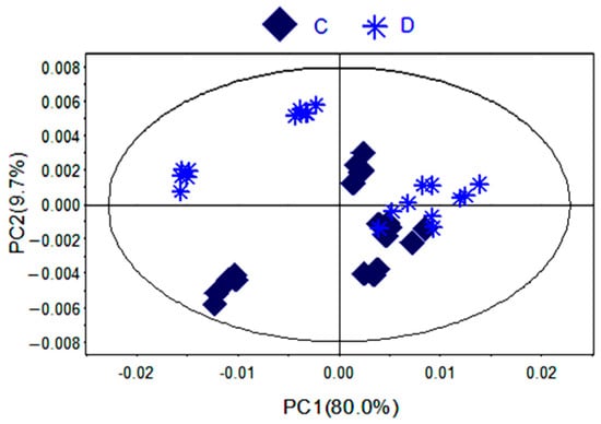 The 1H-NMR spectra were processed using MestReNova software (Version 6.1, Mestrelab Research, Santiago de Compostela, Spain), the FID signal was made by Fourier transformation to improve the signal to noise ratio, spectral intensities were scaled to TSP and reduced to integrated regions of equal width (0.002 ppm) according to the region of δ 0.50–10.00. The two regions of δ = 3.355−3.363 and 4.67–4.98 were excluded from analysis because of the residual signals of methanol and water. The integral data (δ = 0.50 to δ = 10.00, except for δ = 3.355−3.363 and 4.67–4.98) were normalized according to peak areas and imported to Microsoft office Excel (Redmond, WA, USA) for the following analysis. The integral data obtained were imported to SIMCA-P 11.5 (Umetrics, Umea, Sweden) for multivariate statistical analysis, including principal component analysis (PCA), partial least squares discriminant analysis (PLS-DA), and orthogonal PLS-DA (OPLS-DA) with VIP > 1.