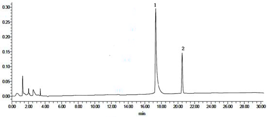 HPLC chromatograms of mixed standards. (1) Heterophyllin B, and (2) heterophyllin A.