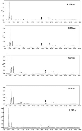 Heterophyllin A (HA) and Heterophyllin B (HB) are the characteristic components in PR. In Chinese Pharmacopoeia 2010, HB was the index component to assess the quality of PR. In this study, the 1H-NMR spectra has not detected these two components; thus, the contents of HA and HB in PR were determined by high performance liquid chromatography (HPLC). The HPLC chromatograms of mixed standards were in Figure 5 and PR samples were in Figure 6. The contents of HA and HB of PR in different cultivated fields were in Table 3. The results showed that the contents of HA and HB in PR from FJZR were much higher than the contents of HA and HB in JSJR. The contents of HB in PR from zs1 and zs2 germplasms were significantly lower than the contents of HB in PR from jr, sb, and xc germplasms; the contents of HA in PR from zs1 and zs2 germplasms were higher than the contents of HA in PR from jr, sb, and xc germplasms. The contents of HA were higher than the contents of HB in PR from zs1 and zs2 germplasms, the contents of HB were higher than the contents of HA in PR from jr, sb, and xc germplasms. This indicated that the genetic factor of germplasms may play an important role in heterophyllins of PR.