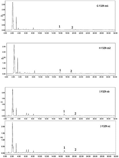 HPLC chromatograms of all samples (A–J). (1) Heterophyllin B, (2) heterophyllin A.