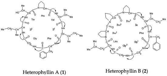 Heterophyllin A (1) and Heterophyllin B (2) (Figure 7) were provided by Professor Ninghua Tan (Kunming institute of botany, Chinese academy of science, Kunming, China). HPLC analysis showed that their purities were over 98%. Analytical grade methanol and acetonitrile were purchased from Sigma (St. Louis, MO, USA). D2O was bought from Norell (Landisville, NJ, USA). Sodium 3-trimethlysilyl [2, 2, 3, 3-d4] propionate (TSP) was obtained from Cambridge Isotope Laboratories, Inc. (Andover, MA, USA). KH2PO4 was from Beijing Chemical Works (Beijing, China), and NaOD was purchased from Armar (Dottingen, Switzerland).