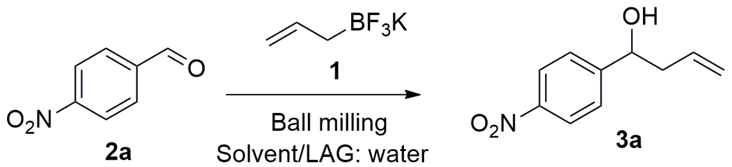 Mechanochemical allylation of p-nitrobenzaldehyde (2a) by potassium allyltrifluoroborate (1).