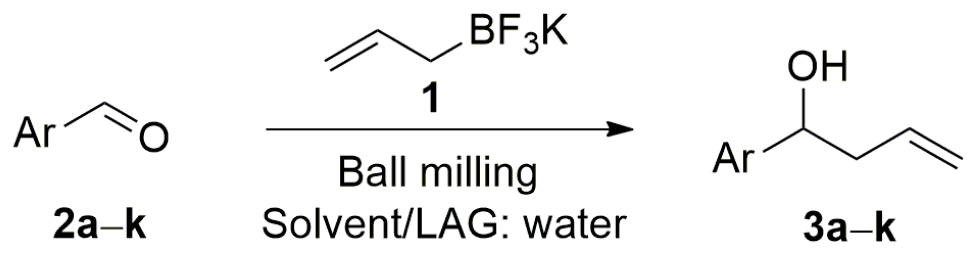 Mechanochemical allylation of arylaldehydes (2a–k) by potassium allyltrifluoroborate (1) yielding homoallylic alcohols (3a–k). Ar = 4-NO2-C6H4, 3-NO2-C6H4, 2-NO2-C6H4, 4-Cl-C6H4, 4-Br-C6H4, 2-OMe-C6H4, 3-OMe-C6H4, 4-OMe-C6H4, 2-Me-C6H4, 1-naftyl, and 2-naftyl.