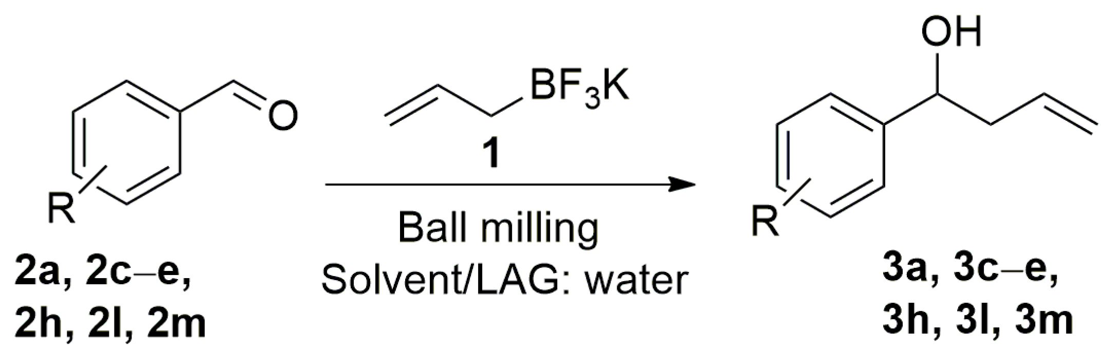 Mechanochemical allylation of substituted benzaldehydes by potassium allyltrifluoroborate (1). R = 4-NO2 (2a), 3-NO2 (2c), 4-Cl (2d), 4-Br (2e), 4-MeO (2h), 3-OH (2l), and 4-OH (2m).