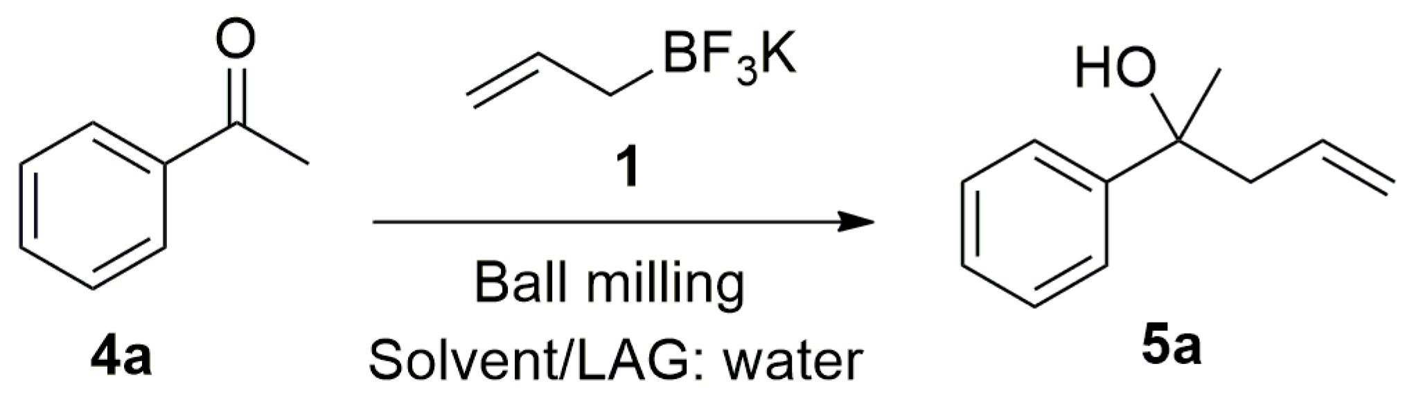 Mechanochemical allylation of acetophenone (4a) by potassium allyltrifluoroborate (1).