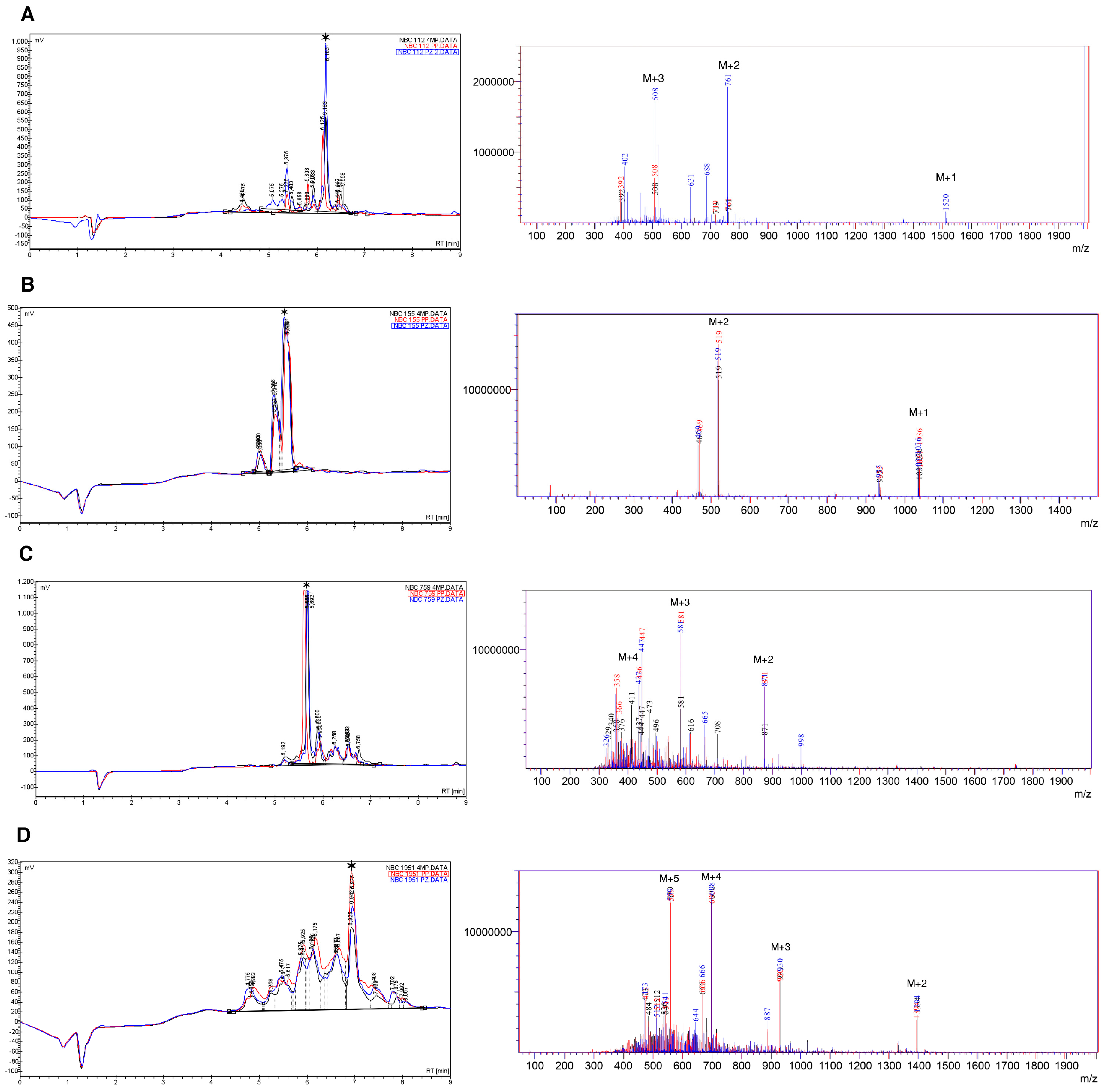 HPLC and mass spectra (ESI-MS) for crude peptides, (A) NBC112; (B) NBC155; (C) NBC759; and (D) NBC1951. The data are superimposed for the three deprotection reagents; Black: 4-Methyl piperidine (4MP), red: Piperidine (PP), and blue: Piperazine (PZ). A star indicates the main species in HPLC. The peaks marked as M + n, in the ESI spectra, indicate the peak for the corresponding n ion of the peptide (M + 1, M + 2, …, M + 5); for details see the Materials and Method section and Table 3.