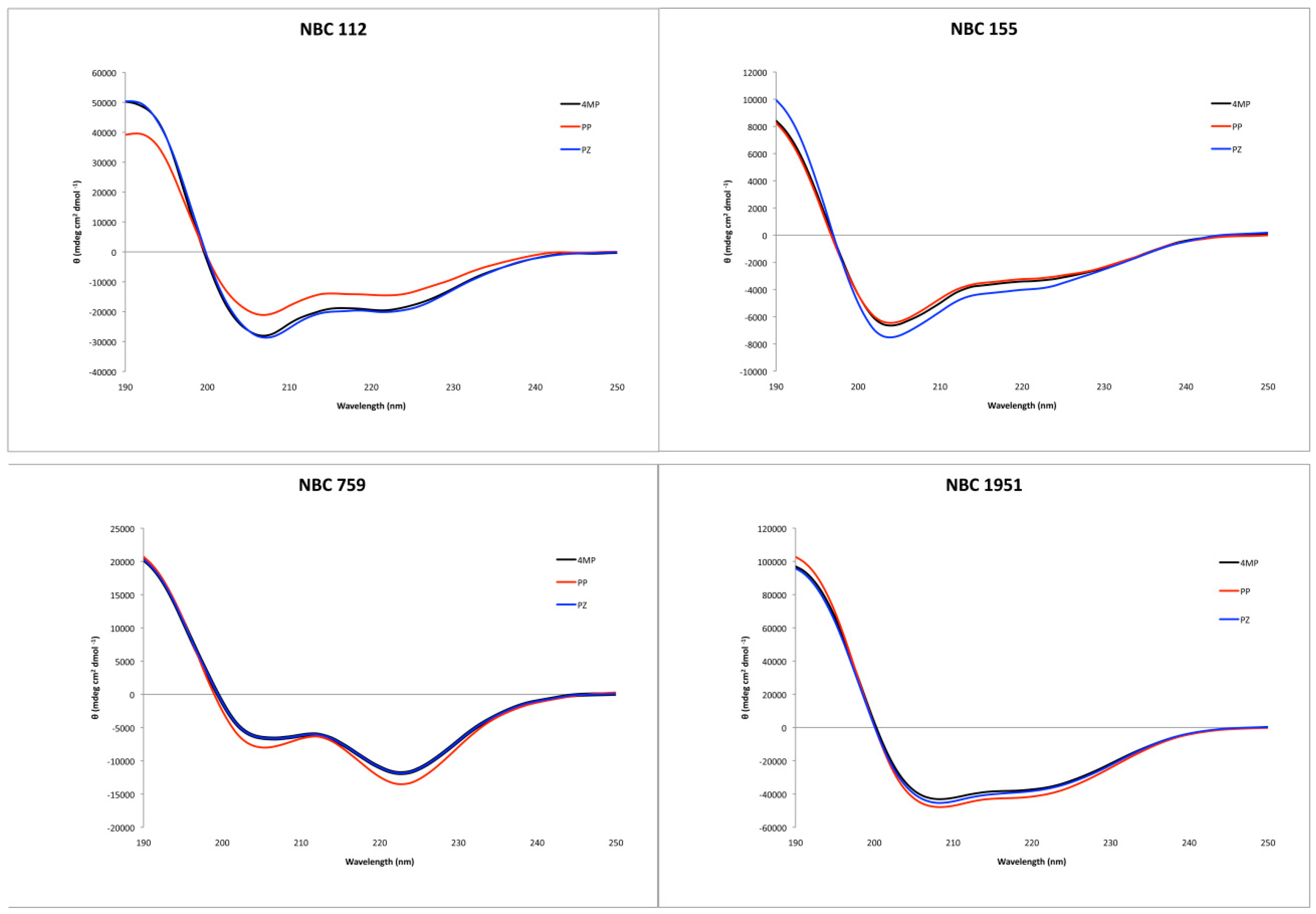Circular dichroism showed an alpha helix tendency for all four peptides (Figure 2), in accordance with previous reports for NBC155 and NBC1951 [16,19]. Pepfold3 server [20] prediction for the secondary structure also showed the alpha helix as the best model for all four peptides.