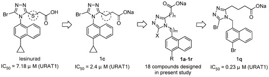 Unlike in other species, in humans and in most non-human primates, uric acid is the final metabolite of dietary and endogenous purine metabolism. Humans lack uricase, an enzyme capable of converting uric acid to allantoin, which is 5–10 times more water-soluble than uric acid and is therefore much more readily eliminated [2,16]. Hyperuricemia is caused by over-production and/or under-excretion of urate, and among the patients with hyperuricemia, 90% of them are urate under-excretors, while 10% are over-producers [1]. Approximately one-third of urate is excreted via the gastrointestinal tract, and the remaining two-thirds via kidney [2]. Most of the urate filtered in kidney is reabsorbed, and this process is mainly mediated by uric acid transporter 1 (URAT1), also known as urate-anion exchanger 1, which is prominently expressed in epithelial cells of proximal tubules in the renal cortex [17]. Given the fact that 90% of the patients with hyperuricemia are urate under-excretors, URAT1 inhibitors, which lower sUA by inducing uricosuria, were believed to be a very promising class of uricosuric agents for the treatment of hyperuricemia and gout [18]. A number of uricosuric agents that had already been approved were later found to be UART1 inhibitors after the identification of URAT1 in 2002 (Figure 1) [17]; however, these agents are associated with a variety of severe adverse effects or drawbacks, such as severe hepatotoxicity of benzbromarone, drug interactions of probenecid with NSAIDs, penicillin, heparin, etc., and limited efficacy of probenecid and sulfinpyrazone [15,17]. Besides, some of them are not available in specific countries. For example, benzbromarone was withdrawn in Europe in 2003 and has never been approved in the US because of severe hepatotoxicity. Lesinurad, a novel URAT1 inhibitor developed by Ardea Biosciences and AstraZeneca, was approved by the FDA at the end of 2015 for the treatment of hyperuricemia associated with gout in combination with an XOI [19]. In a study on lesinurad derivatives as URAT1 inhibitors in our laboratories, we were surprised to find that compound 1c, the sodium salt of 10b derived from the replacement of the S atom in lesinurad with CH2, was three-fold more potent than parent lesinurad in in vitro URAT1 inhibitory assay (Figure 2). This preliminary finding suggested that the S atom might not be indispensable and its replacement with CH2 could even increase the URAT1 inhibitory activity. Encouraged by this preliminary finding and promising hypothesis, we carried out a systematic structure–activity relationship (SAR) exploration of this interesting molecular scaffold, with the expectation of a better understanding of its SAR. Fortunately, the systematic SAR exploration led to the discovery of 1q as a highly potent URAT1 inhibitor, which was 31-fold more active than parent lesinurad in in vitro URAT1 inhibitory assay (IC50 = 0.23 μM against human URAT1 for 1q vs. 7.18 μM for lesinurad).