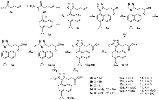 The synthetic route to target compounds 1a–1f was shown in Scheme 1. Ester 2a was treated with 80% aqueous hydrazine hydrate in methanol at room temperature to smoothly give acyl hydrazide 3a. An efficient one-pot, three-component synthetic approach was employed to construct the desired 1,2,4-triazole core, which involved the initial condensation of 3a and N,N-dimethylformamide dimethyl acetal (DMFDMA) in acetonitrile at 50 °C in an open vessel to produce an adduct that in turn reacted with amine 4a added subsequently in refluxing acetic acid to furnish 1,2,4-triazole 5a via ring closing [20]. Dihydroxylation of olefin 5a by treatment of 5a with osmium tetroxide and N-methylmorpholine N-oxide (NMMO) in THF/H2O (4/1) at room temperature afforded the corresponding diol, which, after isolation and purification, was further treated with sodium periodate in THF/H2O (4/1) at room temperature to yield aldehyde 6a [21]. Pinnick oxidation of aldehyde 6a with NaClO2 in the presence of NaH2PO4 and 2-methyl-2-butene in t-BuOH/H2O (4/1) at room temperature cleanly produced the corresponding carboxylic acid 7a [22]. Esterification of 7a with methanol in the presence of 1-ethyl-3-(3-dimethylaminopropyl)carbodiimide hydrochloride (EDCI) and 4-dimethylaminopyridine (DMAP) in dichloromethane at room temperature smoothly produced ester 8a. However, an initial attempt to achieve this esterification with 1,3-dicyclohexylcarbodiimide (DCC) in replacement of EDCI was unsatisfactory because an appreciable amount of intermediate resulting from the adduction of 7a and DCC was observed even in refluxing tetrahydrofuran, which eventually resulted in a quite low yield of 8a. Halogenation at 5-position of 1,2,4-triazole ring in 8a was achieved by treatment of 8a with N-halosuccinimides (NCS, NBS and NIS) in acetonitrile at room temperature (NBS) or at reflux (NCS and NIS), leading to the formation of 9a–9c. Aromatic nucleophilic substitution of the Br atom in 9b by treatment of 9b with MeONa and EtONa in corresponding alcohols at reflux successfully produced 9d and 9e, respectively, albeit in quite low yields (14% for 9d and 13% for 9e). It should be noted that methyl/ethyl transesterification occurred in the case of 9e. Alkaline hydrolysis of esters 9a–9e with aqueous LiOH in methanol at room temperature afforded corresponding carboxylic acids 10a–10e. Finally, acids 7a and 10a–10e were converted to sodium salts thereof 1a–1f with aqueous NaOH in methanol for the sake of improving the solubility in in vitro URAT1 inhibitory assay.