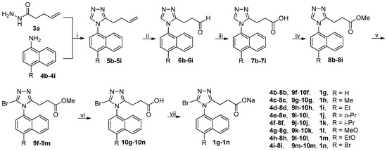 The synthetic route to target compounds 1g–1n was summarized in Scheme 2. Following the identical procedure used for the synthesis of 1c starting from 3a and 4a, target compounds 1g–1n were successfully prepared from 3a and 4b–4i. It should be noted that brominations of 8g and 8h with NBS at room temperature led to the formation of large amounts of byproducts (byproducts/9k or 9l = 55/45) that were preliminarily identified by 1H-NMR to result from the bromination at the naphthalene ring instead of the desired 5-position of 1,2,4-triazole ring. This phenomenon is consistent with the theoretical prediction that the naphthalene ring activated by strongly electron-donating alkoxy groups readily undergoes electrophilic substitution; on the contrary, the bromination of 8i needed elevated temperature (60 °C) to reach a reasonable reaction rate due to the presence of a weakly electron-withdrawing Br atom at 4-position of the naphthalene ring. In an unsuccessful attempt, it was experimentally found that a counterpart of 8i with R being NO2, a strongly electron-withdrawing group, could not even be brominated with NBS even in refluxing acetonitrile.