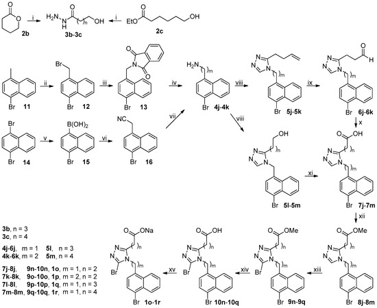 The synthetic route to target compounds 1o–1r was depicted in Scheme 3. Esters 2b and 2c were hydrazinolyzed to acyl hydrazides 3b and 3c, respectively, following the procedure used for the synthesis of 3a from 2a except that the hydrazinolysis of 2c needed to be carried out at reflux. Compound 11 was treated with NBS in the presence of benzoyl peroxide (BPO) in refluxing n-hexane to furnish 12, which was in turn transformed to corresponding amine 4j via Gabriel synthesis involving the reaction of 12 and potassium naphthalimide in DMF at 100 °C to give 13 and subsequent hydrazinolysis of 13 with 80% aqueous hydrazine hydrate in refluxing ethanol to yield 4j [23]. Transformation of bisbromide 14 to mono-boronic acid 15 was achieved by treatment of 14 with 1 eq of n-BuLi at −78 °C followed by quenching with triisopropyl borate. Aryl boronic acid 15 was coupled with aminoacetonitrile to afford aryl acetonitrile 16 according to an efficient deaminative coupling approach which involved the reaction of 15 and aminoacetonitrile hydrochloride in the presence of sodium nitrite in toluene/H2O (20/1) at 50 °C [24]. An initial attempt to construct aryl acetonitrile 16 by Suzuki coupling, which involved the reaction of 15 and chloroacetonitrile under a well-established Pd-catalyzed condition [25,26], was unsuccessful in that a complex mixture of unidentified products was formed presumably due to the competitive reactions resulting from the presence of two cross-coupling acceptors (aryl bromide 15 and chloroacetonitrile) in this case. Reduction of aryl acetonitrile 16 with lithium aluminum hydride in dried THF at room temperature smoothly afforded desired amine 4k. Amines 4j–4k and hydrazide 3a were transformed to 7j–7k following the same procedure used for the synthesis of 7a from 4a and 3a. On the other hand, amine 4j and hydrazides 3b–3c were subjected to the same procedure used for the synthesis of 5a from 4a and 3a to produce 5l–5m. TEMPO/NaClO-catalyzed oxidation of 5l–5m with sodium chlorite in acetonitrile/phosphate buffer (pH = 6.7) at 35 °C smoothly produced corresponding carboxylic acids 7l–7m, respectively [27]. Carboxylic acids 7j–7m were transformed to target compounds 1o–1r following the procedure for the synthesis of 1c from 7a.