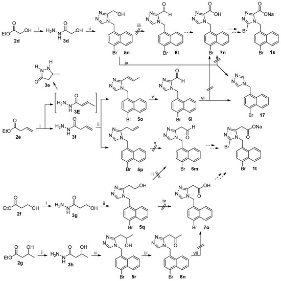 The unsuccessful synthetic routes to anticipated target compounds 1s and 1t were depicted in Scheme 4. Ester 2d was transformed to 5n according to the procedure used for the synthesis of 5l–5m from 2b–2c described above. Swern oxidation of triazolylmethanol 5n to corresponding triazolylaldehyde 6l involving the treatment of 5n with (COCl)2/DMSO/Et3N [28] was unsuccessful in that a complex mixture of unidentified products was formed. Aldehyde 6l was initially expected to be transformed to anticipated target compound 1s by the procedure used for the synthesis of 1c from 6a. Direct oxidation of primary alcohol 5n to corresponding carboxylic acid 7n with TEMPO/NaClO-catalyzed oxidation, aforementioned, to avoid the involvement of aldehyde 6l was also unsuccessful because 17 was isolated as the major product that clearly resulted from the decarboxylation of 7n, strongly indicating that 7n was probably an unstable compound. Hydrazinolysis of 2e under the reaction conditions described above led to the formation of 3e and 3f in a ratio of approximately 1/9; the isolation of 3e unambiguously suggested the formation of 3E during the hydrazinolysis of 2e, an isomer of 3f resulting from the C=C double bond migration [29]. 1,2,4-Triazole formation from 3f and 4j under the reaction conditions as described above led to the formation of 5o and 5p in a ratio of approximately 1/5, suggesting that the C=C double bond migration also occurred to a notable extent in this reaction. Transformation of olefin 5o to aldehyde 6l according to the procedure used for the transformation of 5a to 6a described above was indeed successful, but further oxidation of aldehyde 6l to carboxylic acid 7n by Pinnick oxidation, aforementioned, failed due to the isolation of decarboxylated product 17 once again, further confirming that triazolylcarboxylic acid 7n was not a stable compound (but the corresponding triazolylaldehyde 6l was). On the other hand, the cleavage of olefin 5p with anticipation to furnish acetaldehyde 6m as described above failed due to the formation of a complex mixture of unidentified products; the latter was initially expected to be used for the synthesis of anticipated target compounds 1t. Ethyl alcohol 5q was prepared from 2f by the procedure used for the synthesis of 5l–5m from 2b–2c. Oxidation of 5q to acetaldehyde 6m by Swern oxidation described above also failed, strongly suggesting that triazolylacetaldehyde 6m was unstable. Direct oxidation of 5q to corresponding acetic acid 7o also failed, leading to a complex mixture of unidentified products. Secondary alcohol 5r was prepared from 2g following the procedure described above. Swern oxidation of 5r under the reaction conditions described above successfully furnished corresponding acetone 6n, but further transformation of methyl ketone 6n to acetic acid 7o by haloform reaction [30] also failed, indicating that triazolylacetic acid 7o was probably unstable.