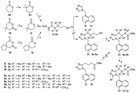 The unsuccessful synthetic routes to anticipated target compounds 1u–1y were depicted in Scheme 5. Ester 2b was treated with lithium diisopropylamide (LDA) generated in situ from n-BuLi and diisopropylamine in dried THF at −78 °C and then quenched by methyl iodide and 1,3-dimethyltetrahydropyrimidin-2(1H)-one (DMPU) at −78 °C to room temperature and this process was repeated twice to give rise to 2h with the gem-dimethyl group at the α-position of carboxylate [31,32]. Reduction of anhydrides 18 and 19 with sodium borohydride in THF at 0 °C to room temperature followed by treatment with 6 M hydrochloric acid afforded esters 2i and 2j, respectively [33]. Hydrazinolysis of 2h–2j under the reaction conditions described above gave acyl hydrazides 3i–3k. 1,2,4-Triazole ring formation with acyl hydrazides 3i–3k and amine 4j under the reaction conditions described above failed because all three reactions uniformly yielded 17 as the major product instead of the desired 5s–5u which were initially expected to be employed for the synthesis of anticipated target compounds 1u–1w. Attempts to introduce a gem-dimethyl group via the approach for the synthesis of 2h from 2b described above and a cyclopropyl group via sequential deprotonation with LDA and quenching with 1,3,2-dioxathiolane-2,2-dioxide [34] at the α-position of carboxylate in 8l to prepare 8q and 8r, respectively, were unsuccessful because a complex mixture of unidentified products was formed in both cases. Esters 8q and 8r were initially expected to be used for the synthesis of the anticipated target compounds 1x and 1y, respectively.
