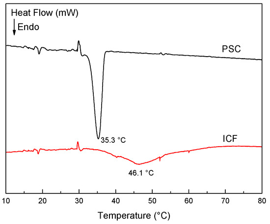 Comparison of DSC heating traces between aqueous 5% dispersions of ICFs (red line) and PSCs (black line).