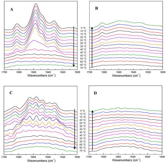 FTIR spectra were collected on an FTIR spectrometer (Perkin Elmer Corporation, Norwalk, CT, USA), which was continuously purged by dry nitrogen during the data collection. Each sample suspension (5% w/v) was placed in a heatable IR transmission cell between two CaF2 windows separated by a 50 µm teflon spacer [31]. The cell temperature was regulated by a high-precision constant temperature system (Ningbo Scientz Biotechnology, Ningbo, China). The temperature change from 5 to 70 °C was obtained by successive heating/cooling cycles at a rate of 1 °C/min with an instrument equilibration time of 10 min before the spectral recording [22,32]. To ensure the signal-to-noise ratio was acceptable, we determined each spectrum by co-addition of 5 scans at a 2 cm−1 resolution.