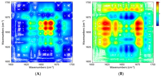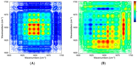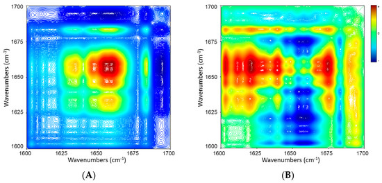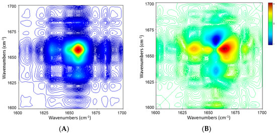 Figure 8 displays synchronous and asynchronous correlation spectra of PSCs during cooling. The synchronous map shows three strong auto-peaks (1639, 1647 and 1656 cm−1) and four weak auto-peaks (1629, 1664, 1675 and 1689 cm−1) (Figure 8A). The sequences of band intensity changes based on the signs of the cross-peaks in the synchronous and asynchronous correlation maps are summarized in Table 6.