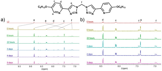 As the [Co2(Lpytrz)3](OTf)6 cylinders were soluble in water, we have undertaken similar stability studies in D2O in the presence of light (Figure 2b and Supplementary Materials, Section 3). The stability of the complexes in D2O was significantly better than that observed in d6-DMSO in the presence of light. The cobalt(III) complexes showed no signs of decomposition over a period of a week in D2O, and no new signals are observed in any of the 1H-NMR spectra. Furthermore, no signals due to “free” ligands are observed, and no precipitate is formed during the monitored time period. In some cases, the acidic triazole and methylene protons of the complexes slowly disappear due to hydrogen-deuterium exchange, but the remaining proton resonances do not shift, confirming that the cylinders remain intact in D2O.