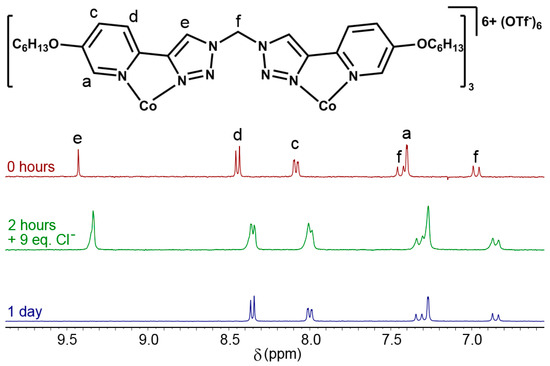 Partial stacked 1H-NMR (400 MHz, 298 K, D2O) of [Co2L23](OTf)6 in the presence of Cl− anions.
