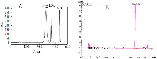 Cy-3-glu solutions (10, 20, 30, 40, and 50 µmol/L) were mixed with formic acid, methanol, and water (3:47:50, v:v:v). Cy-3-glu content was detected with HPLC-DAD after 0.2 μm organic membrane filtration and darkening after 1 h. A drawing standard curve was then obtained. Sample determination was performed as follows: 1 mL of sample was analyzed on a Waters-e2695-HPLC-DAD system from Waters Co. (Milford, MA, USA) Agilent 1100 workstation from Aglilent Co. (Denver, CO, USA) equipped with 0.2μm organic membrane filter. The chromatographic conditions were as follows: The analyses were performed on a Diamonsil C18 column (250 mm × 4.6 mm, 5 μm), the flow rate was 1.0 mL/min, the column temperature was set at 35 °C, 20 µL of sample was analyzed at 520 nm; mobile phase A contains 5% formic acid aqueous solution, and mobile phase B consists of formic acid, methanol, and water (5:45:50, v:v:v). The elution program was as follows: 40% B gradient elution for 3 min at 0.4 mL/min flow rate; then B phase was increased from 40% to 60% within 24 min at 0.4 mL/min flow rate; B phase gradient was subsequently increased from 60% to 100% within 5 min at 0.8 mL/min velocity; finally, B phase gradient was reduced to its original concentration of 40%; baseline was balanced for 8 min [27].