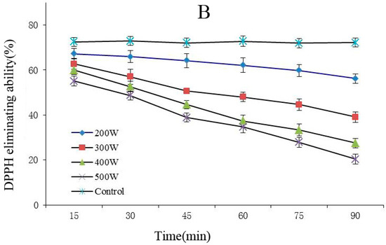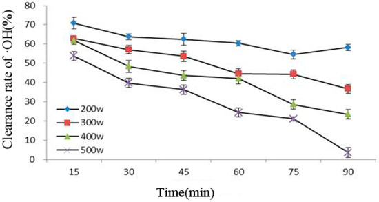 Figure 4 shows that under the same ultrasonic power, the ability of Cy-3-glu to remove ·OH under increasing ultrasonic time gradually decreased; in addition, the greater the power, the stronger the influence would be. This phenomenon was caused by cavitation during power ultrasound, causing molecules to produce ·OH, which in turn attacked Cy-3-glu, resulting in the lost ability of the latter to scavenge free radicals. Thus, the ability of Cy-3-glu to remove ·OH decreased [23,24]; the greater the intensity of power ultrasound, the more severe the damage would be.