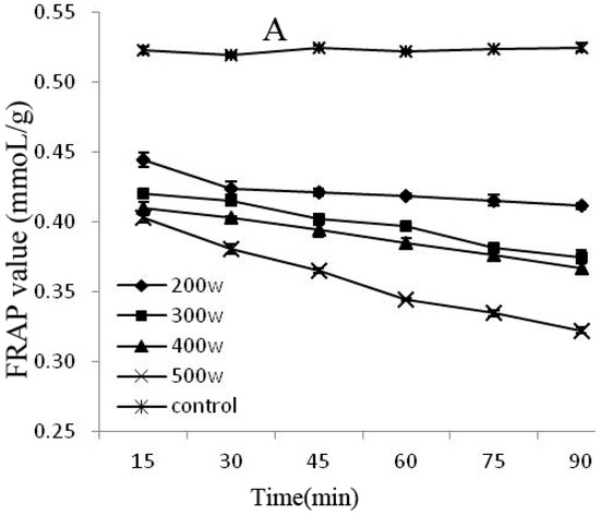 The FRAP and DPPH methods are rapid, simple, sensitive, and reproducible, whereas the beta carotene-linoleic acid method uses only a small amount of samples and reagents, making these methods advantageous [25]. Therefore, this experiment combined the FRAP, DPPH, and beta carotene-linoleic acid systems, which comprehensively evaluated the changes of the degradation of the anthocyanins antioxidant activity after power ultrasound. FRAP (A) and DPPH (B) activity changes in Cy-3-glu solution system after power ultrasound are shown in Figure 5. Compared with that in the control, the FRAP and DPPH antioxidant activity of Cy-3-glu solution system after power ultrasound decreased, and the trend was more significant under increased power and prolonged treatment (p < 0.05).