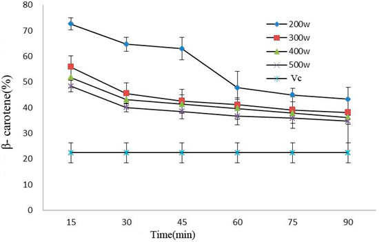Processing power and time would affect the antioxidant activity of beta carotene in anthocyanins. Oxidation resistance declined under prolonged processing time, and such a decline became more significant under 200 W (p < 0.05). In addition, the antioxidant capacity of the anthocyanin solutions was considerably stronger than that of VC solution after power ultrasound (p < 0.05) (Figure 6).