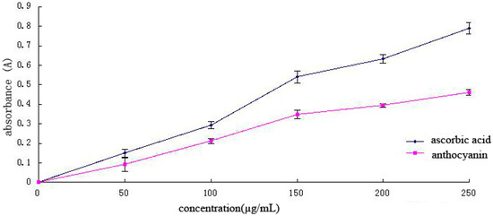 The total antioxidant capacity is the sum of the effectiveness of different active ingredients to remove all kinds of free radicals; thus, total antioxidant capacity is an important indicator in evaluating the antioxidant function of bioactive substances [26,27]. Antioxidants in samples are positively correlated with decreasing power (Figure 7). With increasing Cy-3-glu solution concentration, the total antioxidant capacity also increased, although its capacity was weaker than that of ascorbic acid. The total antioxidant capacity of ascorbic acid was nearly two times than that of Cy-3-glu solution.