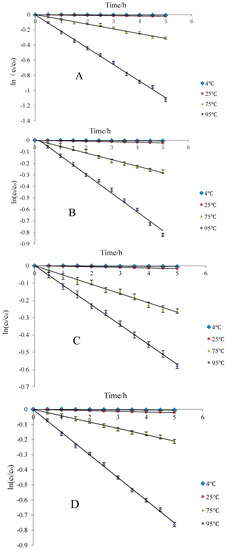 Cy-3-glu in blueberries powder (0.1 g) was weighed and dissolved up to a constant volume of 50 mL (pH = 3) in deionized water and 10%, 20%, 50% ethanol at 4 , 25, 75 , and 95 °C, respectively. Samples (2 mL) were obtained from each group every 30 min and then immediately cooled in ice water. As mentioned in Section 2.3, the degradation dynamics must be analyzed to determine the variation in Cy-3-glu concentration [32,33].