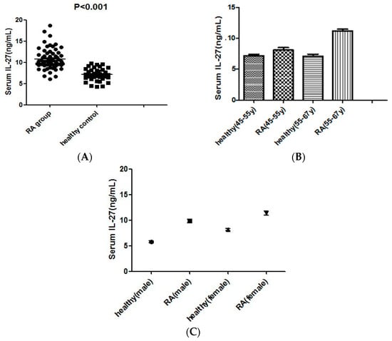 Serum levels of IL-27 were measured in RA patients and healthy controls by ELISA. As shown in Figure 1A, IL-27 was ubiquitously present in human serum, and IL-27 concentrations were significantly higher in RA patients than in control subjects (10.7 (6.2–11.1) vs. 6.2 (4.2–8.9)) (p < 0.001). The levels of serum IL-27 increased with age in RA patients. However, this phenomenon did not exist in the healthy group (Figure 1B). The difference was performed in female and male (Figure 1C).