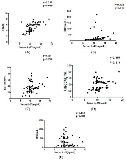 Previous studies have uncovered that treatment with exogenous IL-27 could alleviate arthritic inflammation and inhibit the defined mediators of inflammation, angiogenesis, cell survival, apoptosis, and tissue damage [,]. Additionally, IL-27 may negatively regulate development of ectopic lymphoid-like structures in RA through controlling effector T cells []. Our study unveiled that there is a coherent correlation of IL-27 concentrations with a DAS28 score. Our research data indicated that levels of circulating serum IL-27 could potentially serve as a surrogate biomarker of RA disease activity. To investigate clinical functions of IL-27 more specifically, studies with larger cohorts of RA patients are demanded.