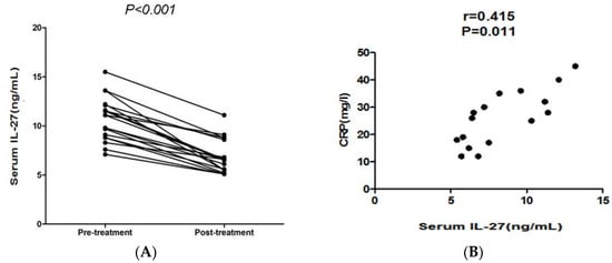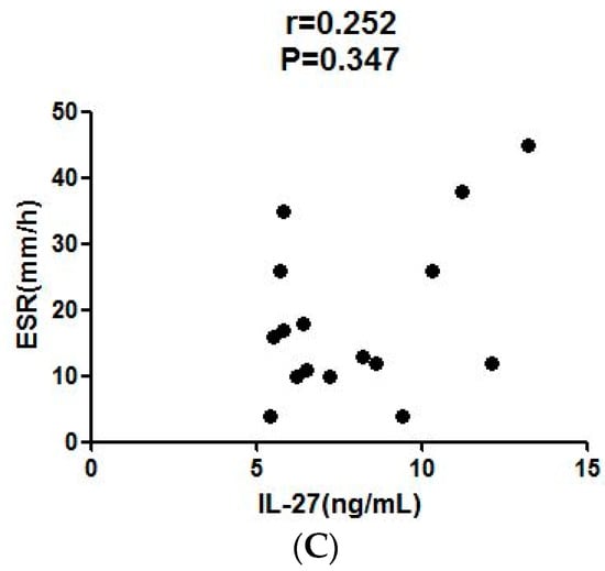 The etiology and pathogenesis of RA is not yet fully understood, but it has been confirmed that dysregulated expression of inflammatory cytokines contributes to its occurrence, persistent inflammation and joint destruction. Interleukin (IL)-27 is a novel member of the IL-6/IL-12 family of cytokines that is produced by antigen-presenting cells []. Recent studies have described IL-27 as a promoter of Th1 differentiation in naive CD4+ T cells. IL-27 also has broad inhibitory effects on Th1, Th2 and Th17 T cells. However, it expanses the population of inducible regulatory T cells (Tregs) [,]. IL-27 is a heterodimeric cytokine consisting of EBI3, an IL-12 p40 homologue originally described to be secreted by Epstein–Barr-virus-transformed B cells, and p28, an IL-6 and p35 homologue [,]. There are a range of cells that express the IL-27 receptor, which is a heterodimer, composed of IL-27 Ralpha and the protein gp130. The IL-27R is expressed on naive T cells, mast cells, endothelial cells etcetera [,,]. In innate immunity, IL-27 can provoke the production of IL-1β, TNF-α, IL-18 and IL-12 in monocytes []. However, more recent studies revealed that IL-27 can also play a regulatory role of suppressing the acquired immunity and expanding the population of inducible Tregs that produce IL-10 [,]. Additionally, in collagen-induced arthritis (CIA) mouse models, administration of IL-27 attenuated the severity of the disease and suppressed monocyte recruitment and angiogenesis []. Although previous reports have shown that IL-27 plays a critical role in the pathogenesis of RA, the molecular basis of the pleiotropic actions of IL-27 in various immune responses has not been well elucidated. In this study, we investigated the presence and significance of circulating IL-27 in RA patients to evaluate its potential as a disease biomarker for RA.