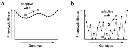 In the most general sense, the relationship between genotype and phenotype can be described by a fitness landscape, and adaptation is an optimizing walk on this high-dimensional surface. In its original formulation, the fitness landscape was envisioned as an n + 1-dimensional function relating all possible alleles of the n loci of a genotype to the phenotypic fitness []. The concept can be extended to describe the relationship between phenotype (e.g., biochemical activity) and all possible variants of a linear, genetically-encoded polymer (such as RNA or protein) of n residues []. Fitness landscapes can be smooth or rugged. In the former case, a series of small genotypic changes (point mutations) will allow continuous optimization of phenotypic fitness (Figure 1a). In the latter, point mutations will commonly be deleterious, and adaptation will be difficult, since most mutants will have reduced fitness and will be culled by natural selection (Figure 1b). Experimental construction of a fitness landscape for a biopolymer of more than a few residues is challenging as it requires both the synthesis of all possible sequence variants (Xn, where X is the number of residue types, for instance 4 for RNA and 21 for proteins, and n is the length of the polymer), and the evaluation of the phenotypic fitness corresponding to each genotype. Advances in high-throughput sequencing methodology, combined with experimental designs in which the abundance of a sequence serves as a proxy for phenotypic fitness, have made it possible to experimentally examine the fitness landscapes of DNAs, RNAs and peptides in the past decade.