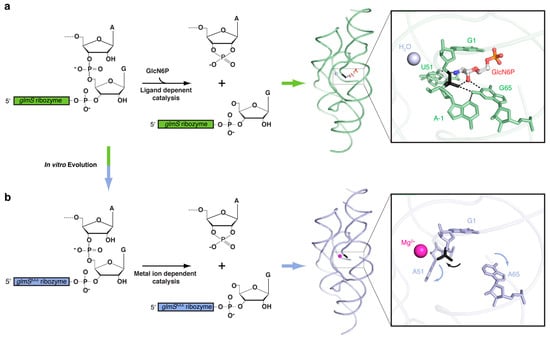 - Lau, M.W.L.; Ferré-D’Amaré, A.R. An in vitro evolved glmS ribozyme has the wild-type fold but loses coenzyme dependence. Nat. Chem. Biol. 2013, 9, 805–810. [Google Scholar] [CrossRef] [PubMed]
