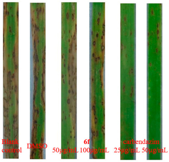 Compound 6f was further measured for its antifungal activity in vivo against RB on rice (Shanyou 63). Different concentrations (50 μg/mL and 100 μg/mL) of 6f (4 mL) were sprayed on two-week old seedlings of rice leaves. After 24 h, previously prepared spore suspension of M. oryzae was also sprayed with 0.2% (w/v) gelatin. Plants were kept at 25 °C with 90% humidity and in a 12/12 h light/dark cycle. The positive control is carbendazim of 25 and 50 μg/mL. Lesion formation was observed daily and the protective efficacies were calculated after 7 days [24].