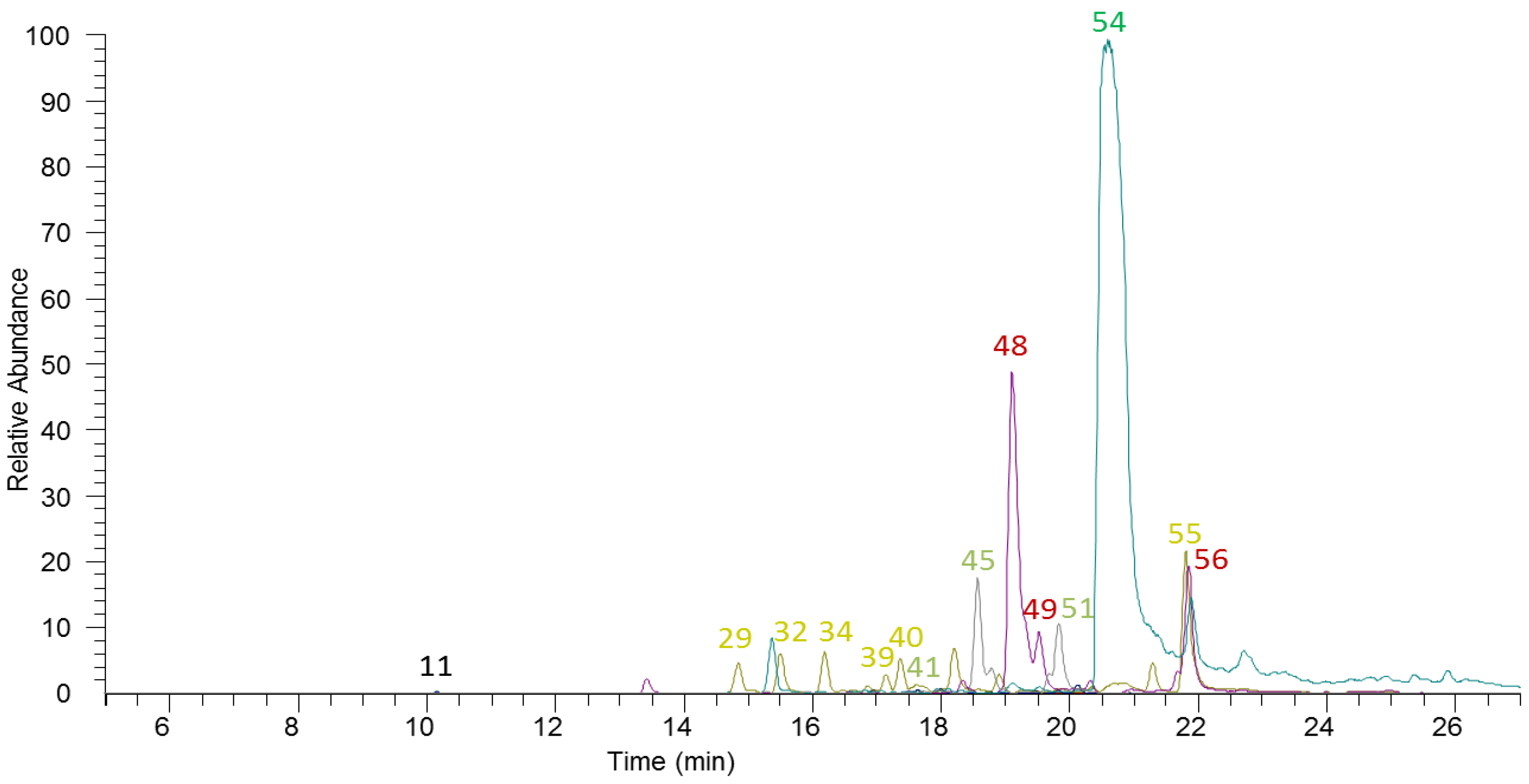 Twenty-four flavonoids, belonging to three subclasses of flavonoids (flavones, flavonols, and flavanones), were tentatively identified. Flavones were the main group of flavonoids in the rosemary extract, with 17 compounds identified. Nine of these were conjugated forms (mainly glycosylated) of luteolin (compounds 4, 5, 12, and 17), apigenin (8 and 25), hispidulin (10 and 27), and a dihydroxy-dimethoxyflavone (13) [3,4,13,24]. A large number of flavone aglycones with different hydroxylation and/or methylation patterns was also detected (14, 16, 21, 23, 26, 30, 37, and 50). The retention time and fragmentation pattern of compound 23 (m/z 299) did not match well with those already reported for other trihydroxy-methoxyflavones previously identified in rosemary extracts such as diosmetin or hispidulin [23]. With respect to flavanones, three aglycones (compounds 19, 28, and 36) and one rutinoside (9) were detected. Isorhamnetin was the only flavonol detected, in both the free (22) and glycosylated forms (6 and 20) [4].