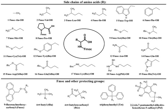 Besides the Nα-Fmoc protection, the other reactive sites of proteinogenic amino acids were also protected to make them appropriate for peptide synthesis protocols: t-butyloxycarbonyl (Boc) for Lys, t-butyl (tBu) for Ser, Thr and Tyr, O-t-butyl (OtBu) for Asp and Glu, triphenylmethyl (trityl, Trt) for Cys and His, and Nω-2,2,4,6,7-pentamethyldihydrobenzofuran-5-sulfonyl (Pbf) for Arg (Figure 1). The protected amino acid derivatives were obtained from different sources. l-amino acids 1 and 2 were purchased from Reanal (Budapest, Hungary), 3–14 and 16 from Orpegen Pharma Gmbh (Heidelberg, Germany), 15 from GL Biochem (Shanghai) Ltd (Shanghai, China), 17 from Iris Biotech Gmbh (Marktredwitz, Germany) and 18 from Merck (Darmstadt, Germany). d-amino acids 3, 4, 6, 9, 10, 12–14, 16, 18 and 19 were obtained from Bachem AG (Bubendorf, Switzerland), 1, 2, 7, 8, 11, 15 and 17 from AK Scientific, Inc. (Union City, CA, USA) and 5 from Advanced ChemTech (Louisville, KY, USA).