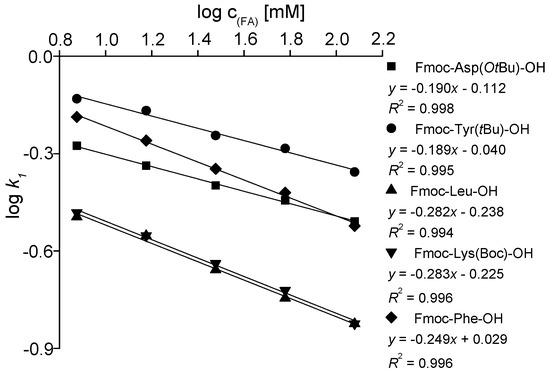 In the case of acidic SAs, long-range strong electrostatic (ionic) interactions between the anionic sites of the SA and the cationic site of the SO have been detected as primary ones, with additional intermolecular SO–SA interactions responsible for chiral discrimination [19,20]. The observed effects are in principle in agreement with the earlier explained simple displacement model [41,42]. Since the cationic site(s) of the SAs is blocked via the Fmoc (Boc) protection groups thus not being able taking part in the ion-pairing process, the deprotonated acid additives in the mobile phase act as counter-ions competing with the deprotonated SAs for the bonding sites of the protonated SOs. Conceptually, the concentrations of the co- and counter-ions should affect the ionic interactions, and retention can be adjusted by the addition of acidic counter-ions. Figure 5 represents the effects of concentration variations of the acidic additives on the retention on ZWIX(+)™ under HO mobile phase conditions. The application of higher counter-ion concentration resulted in lower retention in accordance with the displacement model of Kopaciewicz [41], where a linear relationship is found between logk1 and logccounter-ion. According to this model, the slopes of these plots are determined by the ratio of the effective charges of the solute and the counter-ions; the observed slopes around 0.19–0.28 correspond with the values of around 0.18–0.26 found on ZWIX(+)™ for the same SAs at SFC conditions [21] and for β-amino acids in PIM [39,40]. On the ZWIX(+)™, under the applied conditions, slopes differed only slightly for each enantiomer, whereas the enantioselectivity remained almost constant (data not shown).