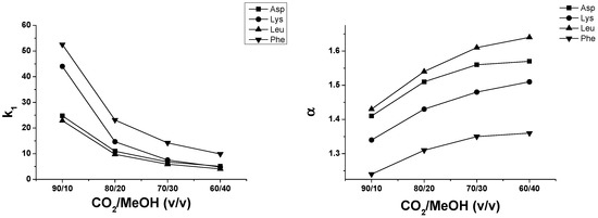 Stock solutions of amino acids (1 mg·mL−1) were prepared by dissolving them in methanol. For determination of the dead-times (t0) of the columns, a methanolic solution of acetone was applied at each investigated temperature and eluent composition. The flow rate was 0.6 mL·min−1 and the column temperature was 25 °C if not otherwise stated.