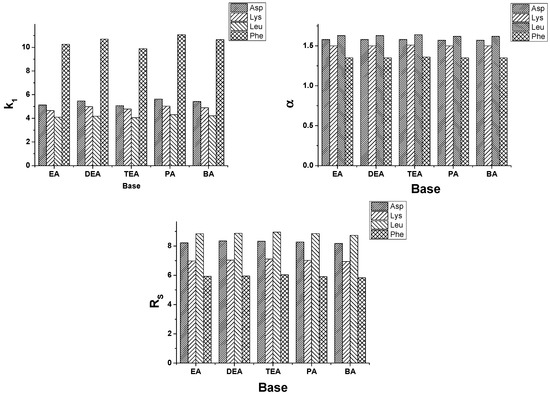 For this series of experiments, FA was selected as acid additive, and EA, DEA, TEA, PA and BA as base additives. In SFC mode on ZWIX(+)™, the nature of base exhibited a slight effect on the chromatographic parameters [21]. With a few exceptions, k1 decreased as the degree of alkyl substitution on the N atom increased; moreover, in most cases, k1 also decreased as the alkyl chain length on the amino group increased [21]. For the investigations of the effects of base additives on QN-AX™ under SFC conditions, experiments were carried out with CO2/MeOH (60/40 v/v) mobile phase containing 30 mM base and 60 mM FA (Figure 7). Our results demonstrated that the nature of base exhibited only very slight effect on the chromatographic parameters; e.g., k1 varied for Fmoc-Asp(OtBu)-OH between 5.07 and 5.47, for Fmoc-Lys(Boc)-OH between 4.65 and 5.03, for Fmoc-Leu-OH between 4.05 and 4.30 and for Fmoc-Phe-OH between 9.89 and 11.07. Regarding α and RS values, the change was much smaller, within 1%–2%.