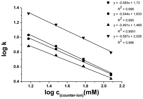 As described earlier on the Cinchona alkaloid-based zwitterionic CSPs in PI and HO mobile phases, an ion-pairing (displacement) process between the SO and the SAs dominates the retention in LC, and the displacement model also applies for the SFC mode [21]. To prove that the ion-exchange mechanism also governs retention on a genuine anion-exchanger CSP run under SFC conditions with CO2/MeOH as a bulk solvent, the concentrations of FA and base were varied in the range 15–120 mM, while the acid-to-base ratio (2:1) was maintained constant. Retention decreased with increasing concentration of FA plus base, and a linear relationship between logk1 and logccounter-ion for all the selected SAs was observed (Figure 8). Thus, the results obtained were in accordance with the displacement model [41,42], and it can be stated that ion-exchangers can efficiently be used in SFC mode.