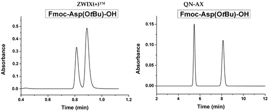 In summary, under liquid chromatographic conditions the zwitterionic and anion-exchanger type CSPs exhibited different separation performances for Nα-Fmoc AAs. While ZWIX(+)™ exhibited in several cases insufficient separation efficiencies, on the QN-AX™ column almost all Nα-Fmoc amino acids could efficiently be separated.